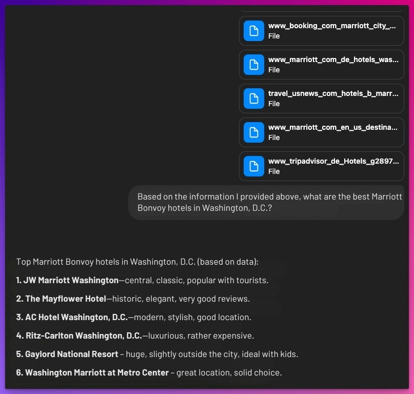 Although the pages are listed as link sources, they are never fully integrated into the context and processed. In other words: the chat does not remember the content, and if you have follow-up questions, the search often starts from the beginning.