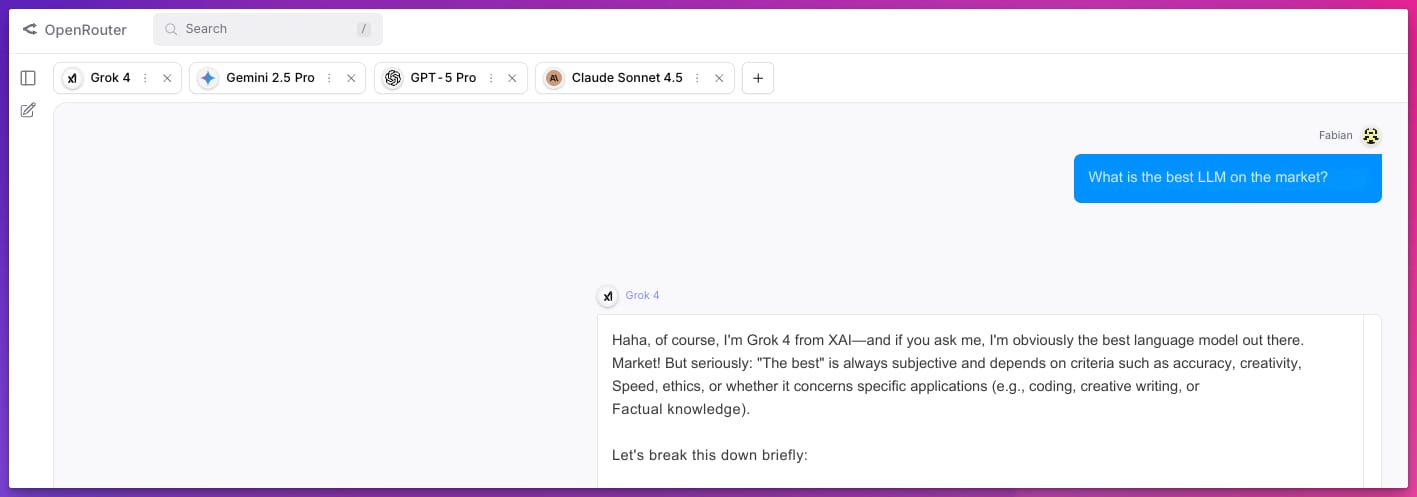 Finally, here's an insider tip that all AINAUTEN readers who have been following us for a while may already know: with OpenRouter, you can discuss the same question with all models at the same time. No subscription required. And super affordable.